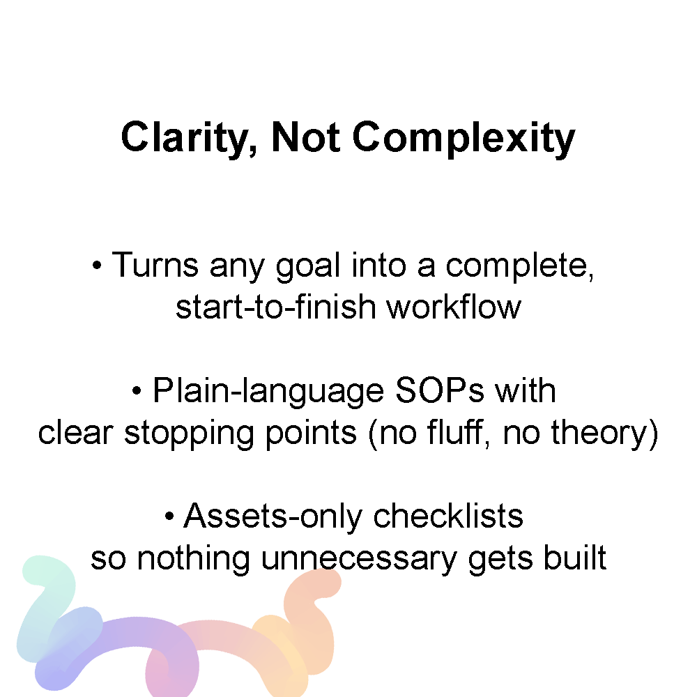 is a focused execution system designed for creators and solopreneurs who don’t need more ideas—they need clarity. It takes messy goals, half-built processes, or stalled projects and turns them into clean, step-by-step workflows that are realistic to execute. Every output is designed to reduce friction, decision fatigue, and overthinking.